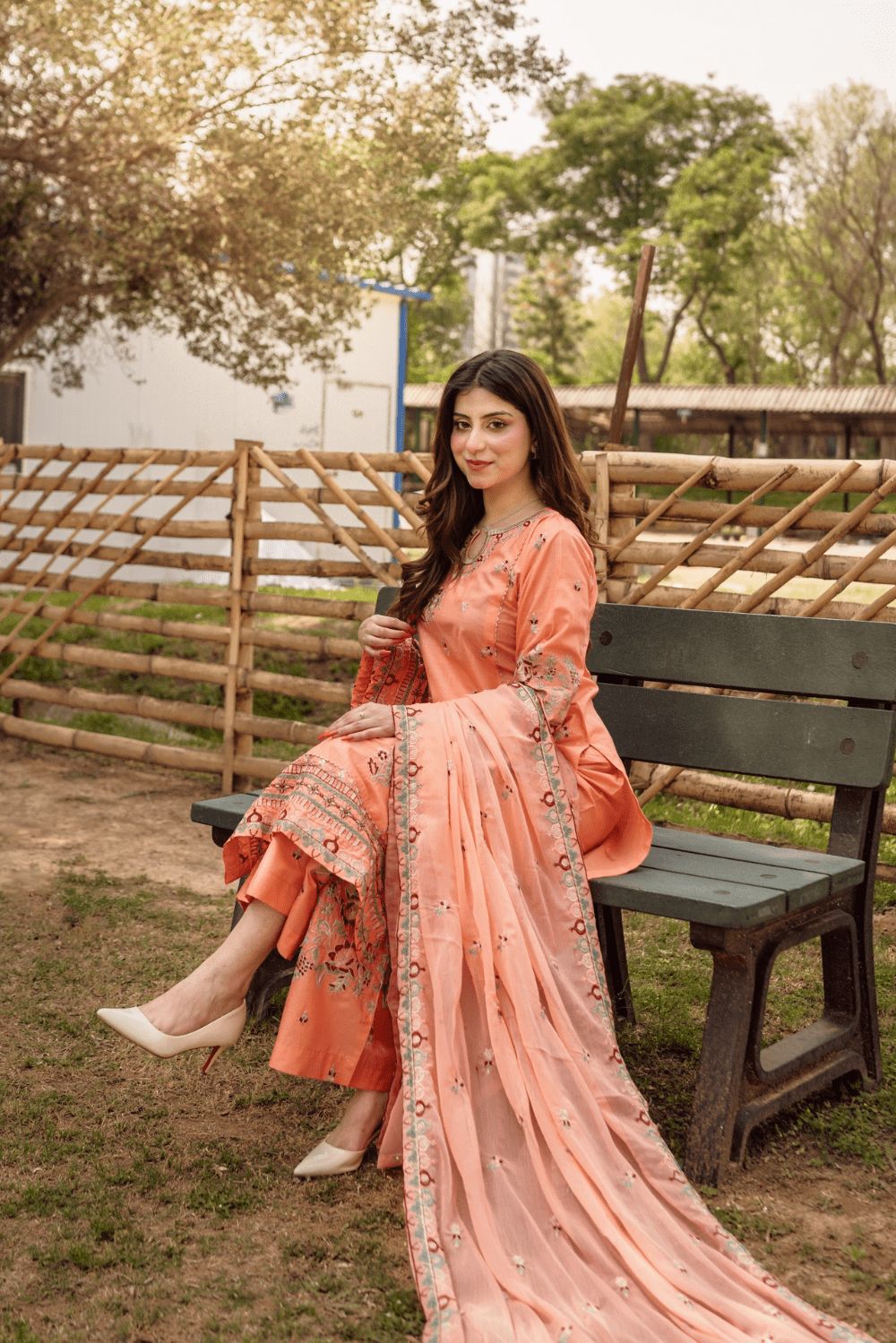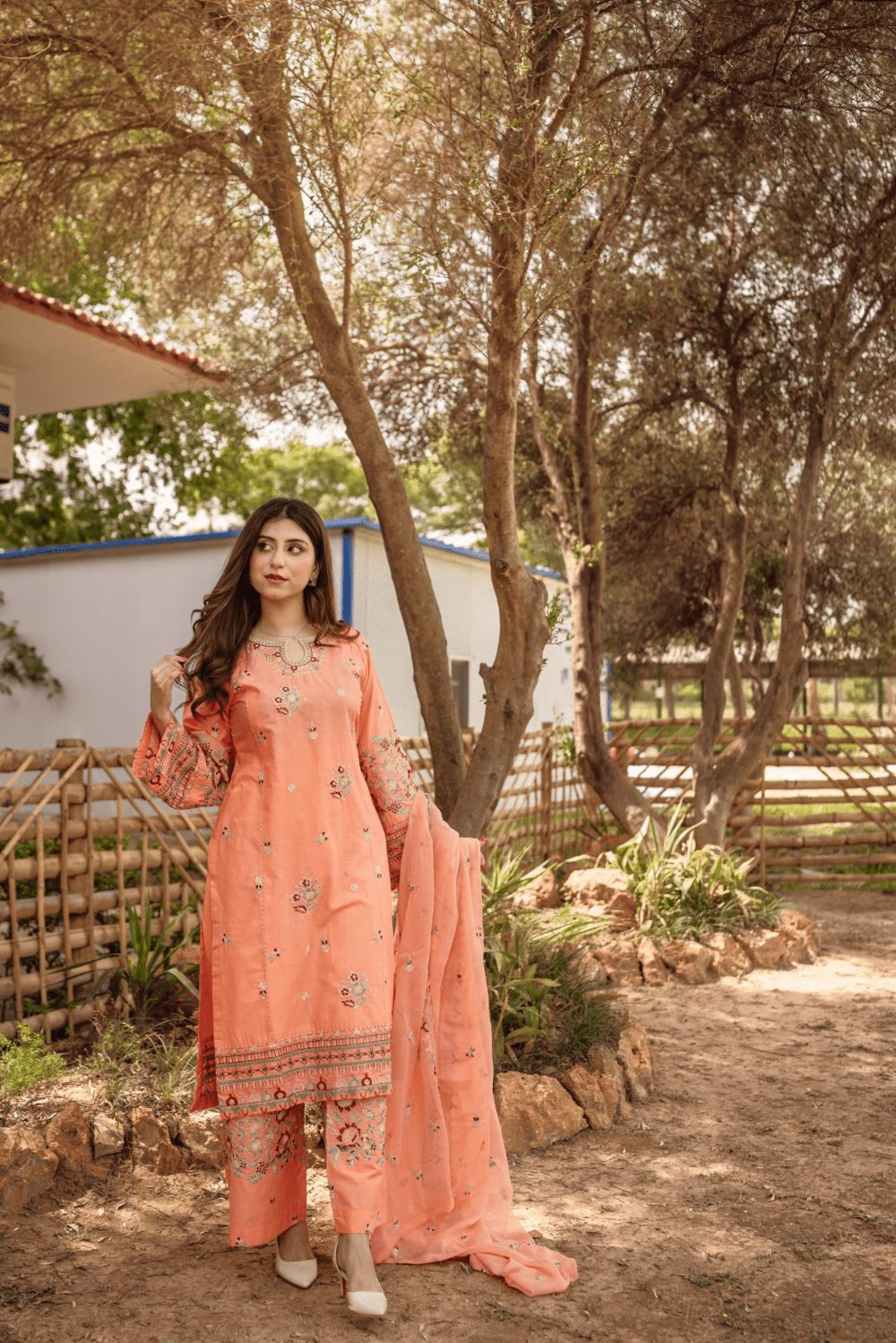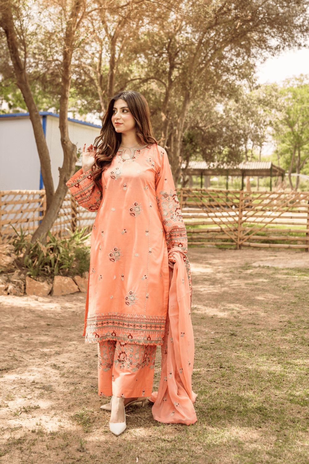 The ensemble includes an embroidered shirt, matching trouser, and a coordinated dupatta, making it a perfect choice for both casual gatherings and semi-formal occasions.