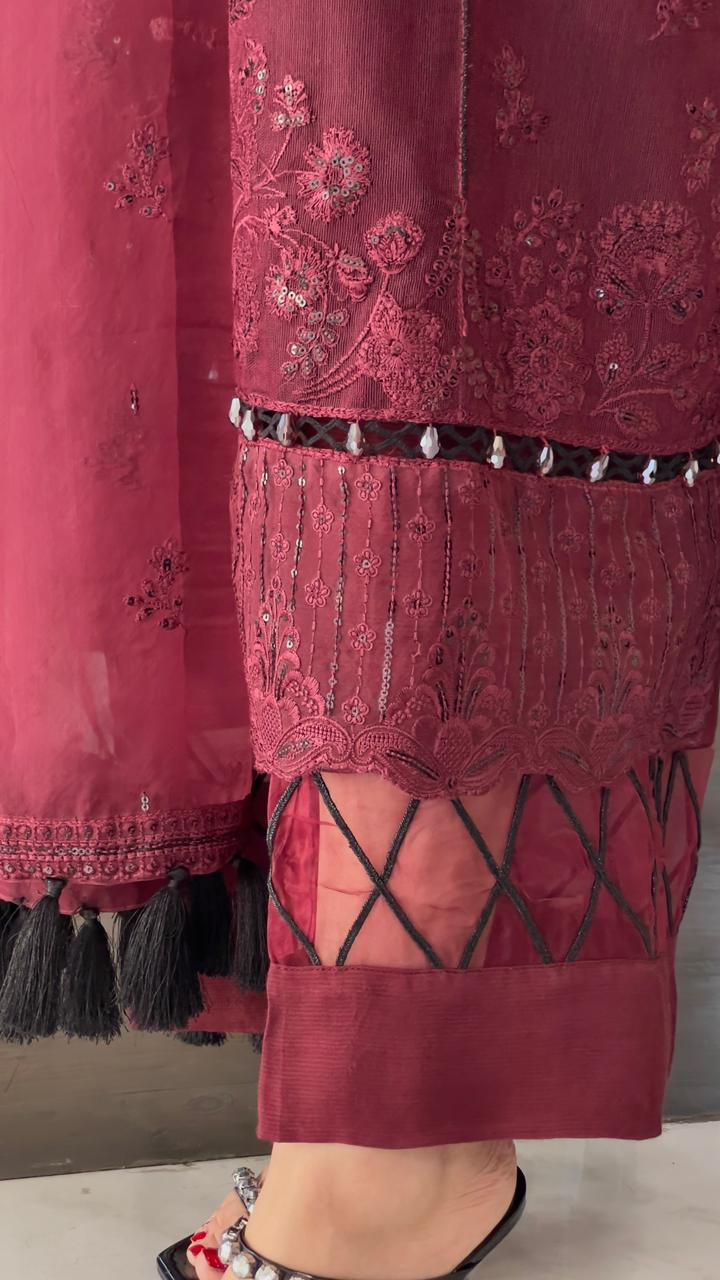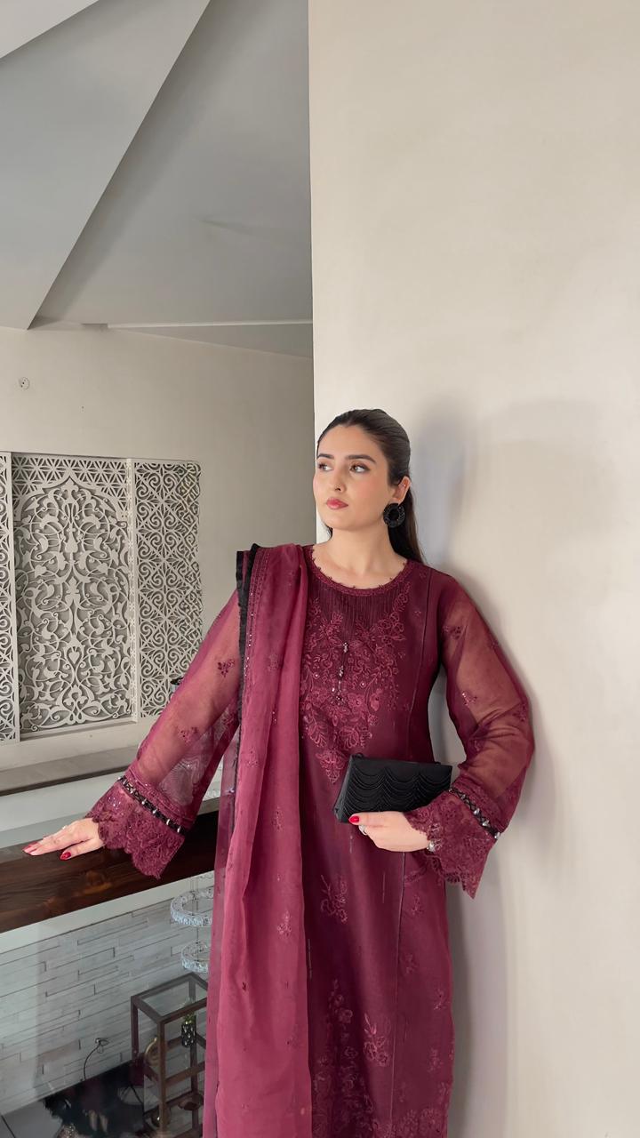 The set includes a beautifully embroidered shirt, a matching trouser, and a coordinated dupatta, creating a complete and well-balanced outfit with a sophisticated finish.