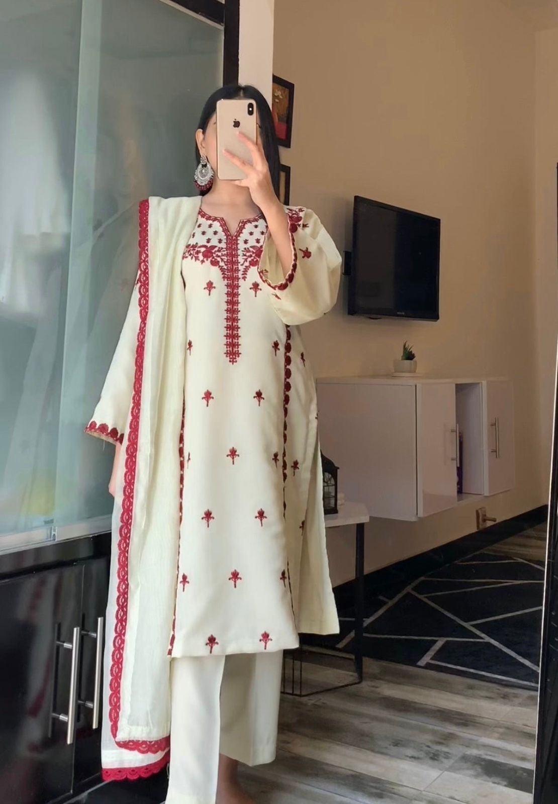 Rayna captures the essence of timeless elegance. Crafted in luxurious Khaadi net fabric, this 3-piece outfit features intricate embroidered work that reflects pure sophistication and charm. Each piece is thoughtfully designed to bring out refined beauty — from the graceful shirt to the perfectly paired trouser and matching dupatta.