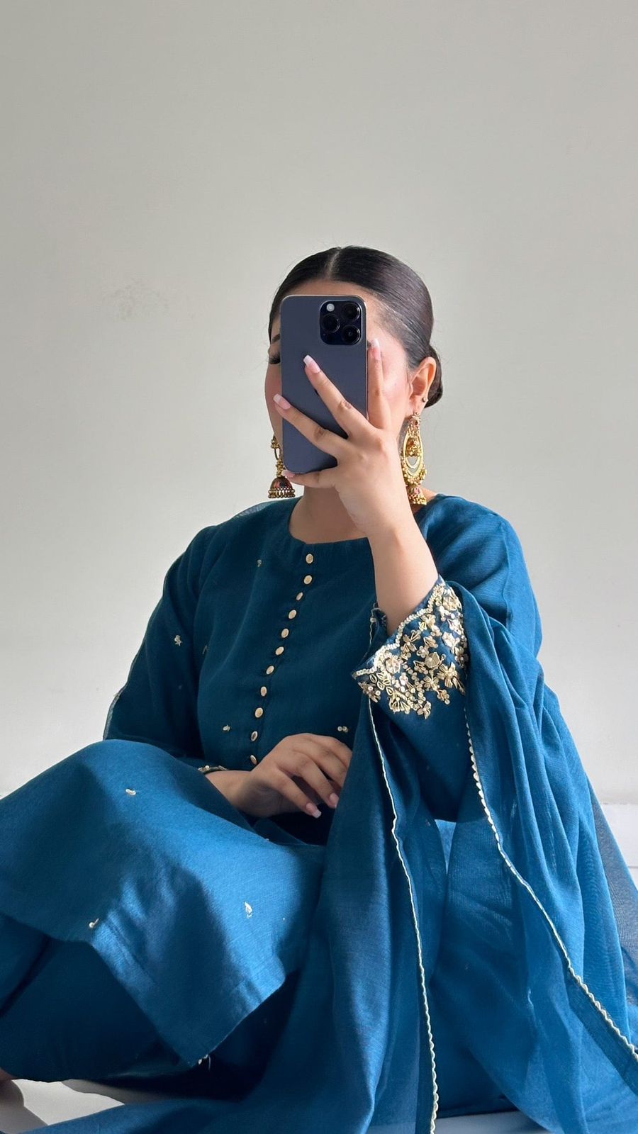 The outfit includes a beautifully hand-embellished shirt, a coordinated trouser, and a matching dupatta, making it the perfect choice for festive occasions, intimate gatherings, or elegant evenings.